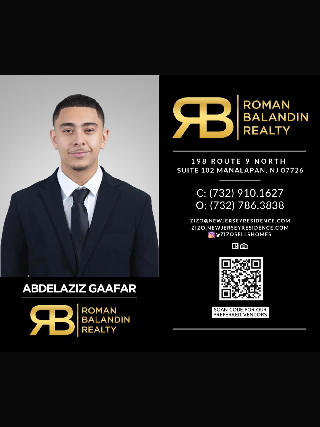 Hi! I’m Abdelaziz “Zizo” Gaafar, your NJ Realtor with Roman Balandin Realty. I’m passionate about helping families and first-time homebuyers find their perfect home while making the journey enjoyable and stress-free. Whether you’re buying or selling, I’m here to support you every step of the way.